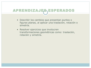 Este documento describe las transformaciones isométricas, que son traslaciones, rotaciones y simetrías que no alteran la forma ni el tamaño de una figura. Explica que una traslación desplaza una figura en una dirección sin cambiar su forma, una rotación gira una figura alrededor de un punto sin cambiar su forma, y una simetría refleja una figura sobre un eje o punto sin cambiar su forma. También cubre cómo estas transformaciones se pueden usar para crear patrones de teselación que cubren completamente una superficie