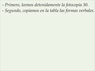 Este documento presenta una guía para la conjugación de verbos griegos en los modos subjuntivo y optativo. Instruye a los estudiantes a leer detenidamente la fotocopia y copiar las formas verbales en una tabla, comenzando con las primeras personas del singular. Explica las funciones del subjuntivo como voluntad o eventualidad y del optativo como deseo o posibilidad.
