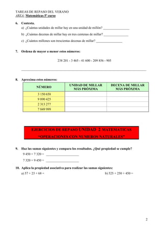Este documento presenta una serie de ejercicios de repaso de matemáticas para el verano divididos en 8 unidades temáticas: números naturales, operaciones con números naturales, división de números naturales, números decimales, operaciones con números decimales, fracciones, operaciones con fracciones y medida de longitud. Los ejercicios incluyen tareas como descomponer y ordenar números, realizar operaciones básicas, trabajar con fracciones y conversión de unidades.