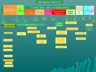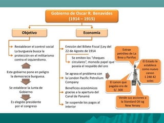 La República Aristocrática en Perú (1895-1919) se caracterizó por el control del Estado y el gobierno por parte de la oligarquía terrateniente y comercial aliada con el gamonalismo provincial. Esta etapa vio el inicio de la industrialización y las reformas laborales como la jornada de 8 horas, aunque la mayoría de la población campesina se mantuvo marginada. Figuras importantes incluyen a Nicolás de Piérola, Guillermo Billinghurst y los presidentes Manuel Candamo y José Pardo y Barreda.