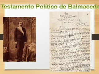 Este documento resume los principales acontecimientos políticos, económicos y sociales de Chile entre 1861 y 1891. Durante este periodo, Chile se expandió territorialmente hacia el sur y descubrió grandes yacimientos salitreros. También se produjeron importantes obras de infraestructura como ferrocarriles, canales y puertos. La guerra del Pacífico (1879-1884) permitió a Chile anexar las provincias peruanas de Tarapacá y Tacna. Finalmente, en 1891 estalló una guerra civil que puso fin al g