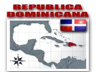 Este documento describe la República Dominicana. Se encuentra en América Central y habla del huso horario, la capital Santo Domingo, la moneda peso, el idioma español y la religión católica. Describe algunas características geográficas como el Pico Duarte, ríos como el Yuna y Ozama, e Isla Beata.