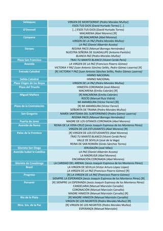 Este documento presenta la ruta y repertorio musical de una procesión dedicada a la Virgen de la Paz. La ruta comienza en el Río de la Plata y concluye en el interior del templo, pasando por diversas calles, glorietas y plazas de Sevilla mientras se interpretan marchas y cantos dedicados a la Virgen y otras advocaciones marianas. En total se listan más de 70 piezas musicales que acompañarán a la Virgen a lo largo del recorrido.