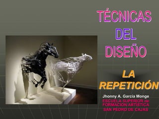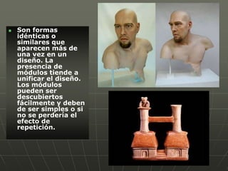El documento describe los tipos de repetición en el diseño. Explica que la repetición implica la presencia de módulos idénticos o similares que unifican el diseño. Describe cuatro tipos de repetición: repetición de figuras, repetición rítmica, repetición de color y repetición aleatoria.