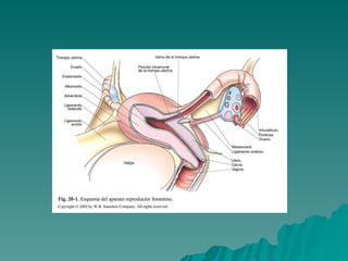 El documento describe el sistema reproductor femenino, incluyendo los ovarios que producen ovocitos y hormonas, las trompas de Falopio que conducen el óvulo hasta el útero donde ocurre el desarrollo embrionario, y la vagina y genitales externos. También explica que la meiosis de los ovocitos se detiene hasta la maduración folicular y solo se completa con la fecundación.