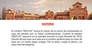 Replay es una marca de ropa fundada en 1978 por Claudio Buziol que reinterpreta la moda vintage con un estilo contemporáneo. La marca se hizo famosa por sus jeans de doble anillo y ha crecido para incluir una amplia gama de productos como ropa, calzado y accesorios para hombres, mujeres y niños vendidos en tiendas propias y departamentales en todo el mundo.