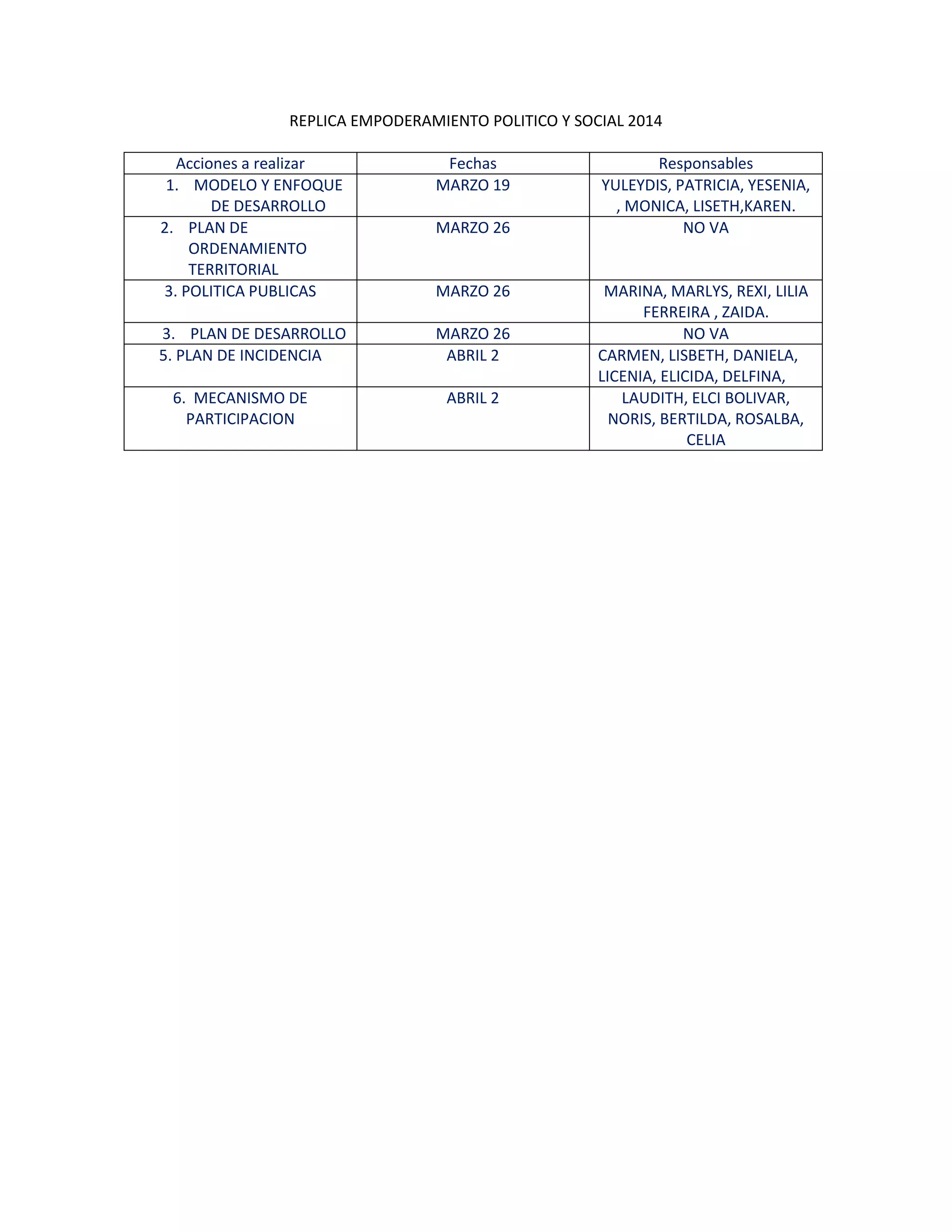 El documento presenta un plan de acciones para empoderamiento político y social en 2014. Incluye 6 acciones a realizar en marzo con fechas y responsables asignados, como desarrollar un modelo de desarrollo, políticas públicas y un plan de incidencia. También enumera 9 acciones adicionales en marzo como cartas para el alcalde, reunión con el alcalde y conmemoración, con fechas y responsables asignados. El objetivo general es empoderar políticamente a mujeres a través de diferentes acciones.