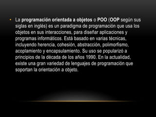 La programación orientada a objetos es un paradigma de programación surgido en los años 1970 que utiliza objetos como elementos fundamentales. Un objeto representa un ente del mundo real con atributos y métodos, y las clases agrupan propiedades y métodos comunes entre objetos para crear instancias u objetos. El lenguaje Simula 67 introdujo los conceptos básicos de POO, luego refinados en Smalltalk, y hoy muchos lenguajes soportan esta orientación.