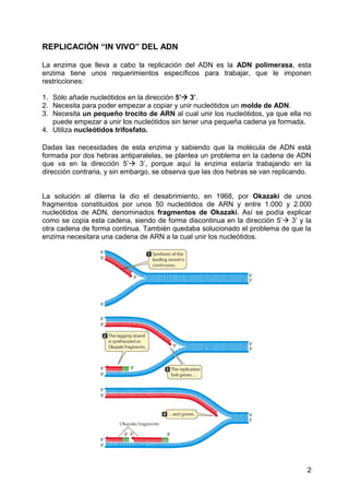 La replicación del ADN conserva la información genética al producir copias idénticas de la molécula de ADN. La hipótesis semiconservativa, propuesta por Watson y Crick, explica que cada molécula hija contiene una cadena original y otra nueva. La enzima ADN polimerasa copia el ADN de forma semiconservativa y bidireccional, corrigiendo errores para mantener la fidelidad de la replicación.