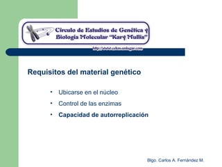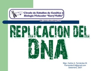 El documento describe los mecanismos de replicación del ADN en procariotas. Explica que el ADN es sintetizado por polimerasas siguiendo las reglas de complementariedad de Watson y Crick, y que la replicación en E. coli ocurre de forma bidireccional desde un origen de replicación y utiliza proteínas como la helicasa DnaB y la proteína de unión a ADN simple cadena. También resume los tres modelos de replicación circular en procariotas: modo θ en E. coli, lazo D en mitocondrias y cloroplastos, y