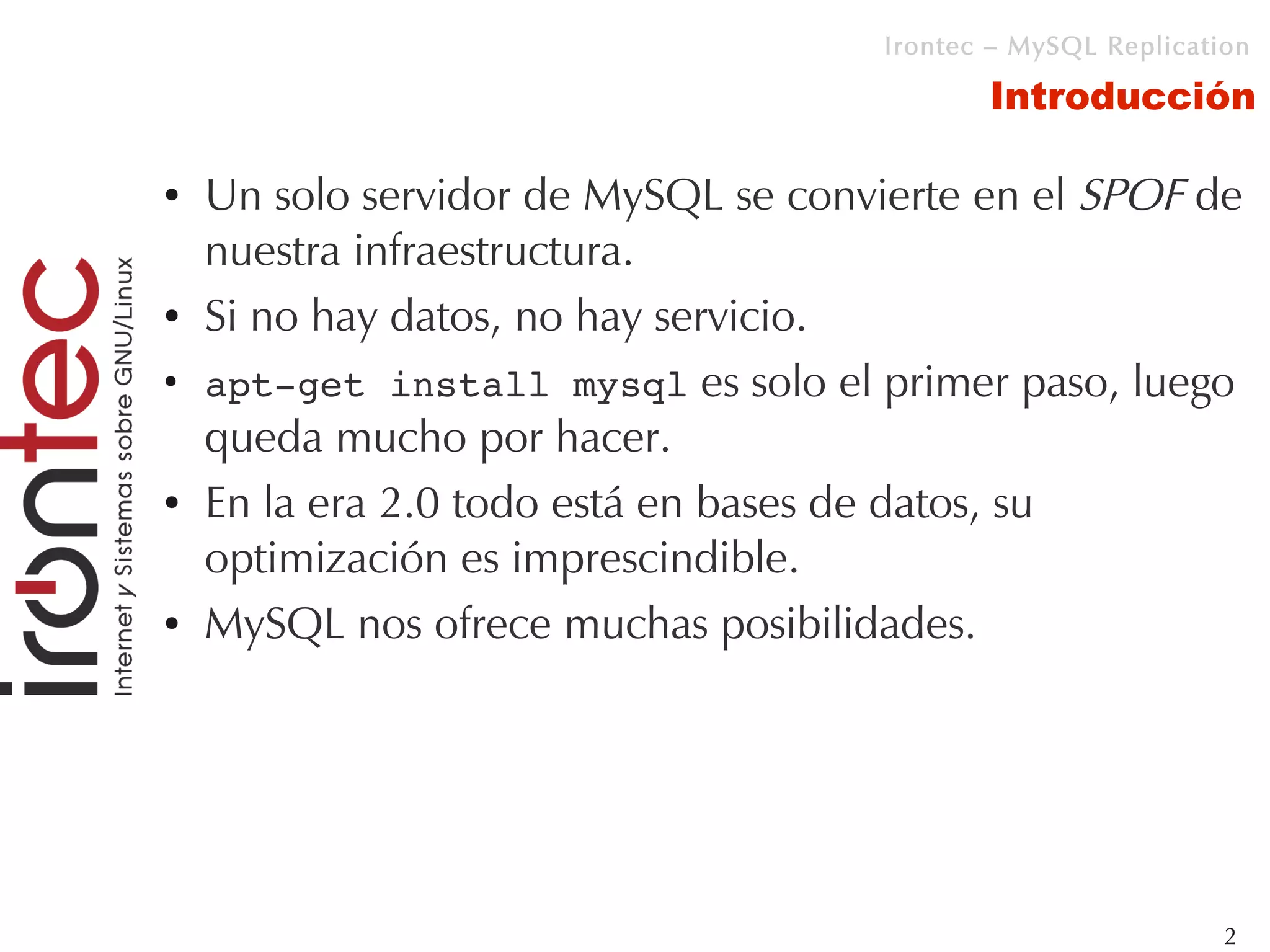 Irontec – MySQLReplication Maestro-Esclavo ● Configuramos el eslavo: – Seleccionamos un ID diferente para cada uno. – Importamos la BD. – Nos configuramos como esclavo de un maestro. $mysql ­u root ­p < dump server­id=101 mysql> CHANGE MASTER TO MASTER_HOST = ‘10.10.10.100’,  MASTER_USER = ‘replication’, MASTER_PASSWORD = ‘slave’,  MASTER_LOG_FILE = ‘master_log_file’, MASTER_LOG_POS =  master_log_pos; 11