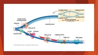 El documento resume los principales aspectos de la replicación del ADN. La replicación es llevada a cabo por enzimas ADN polimerasas que copian fielmente la hebra molde de ADN. Estas enzimas requieren proteínas accesorias y el proceso es semiconservativo, copiando una hebra molde original y una nueva hebra complementaria. La replicación ocurre de forma simultánea en ambas hebras a través de la acción coordinada de enzimas y proteínas asociadas.