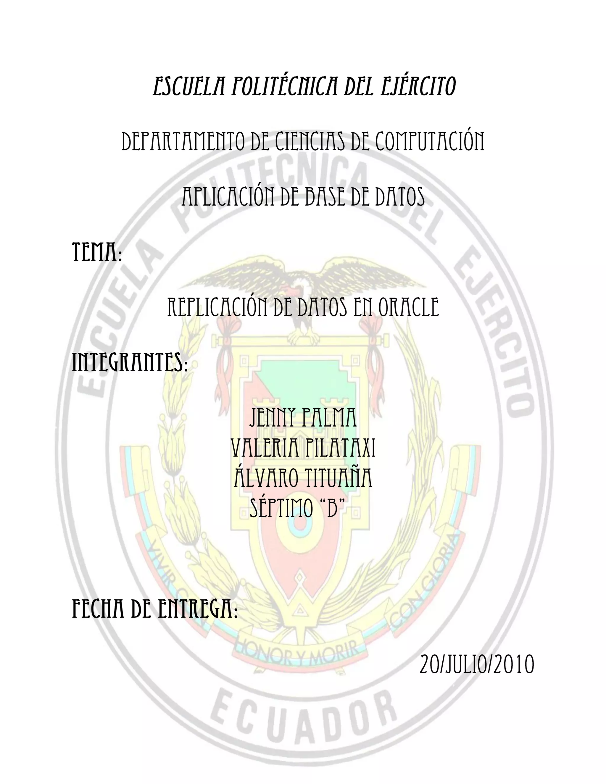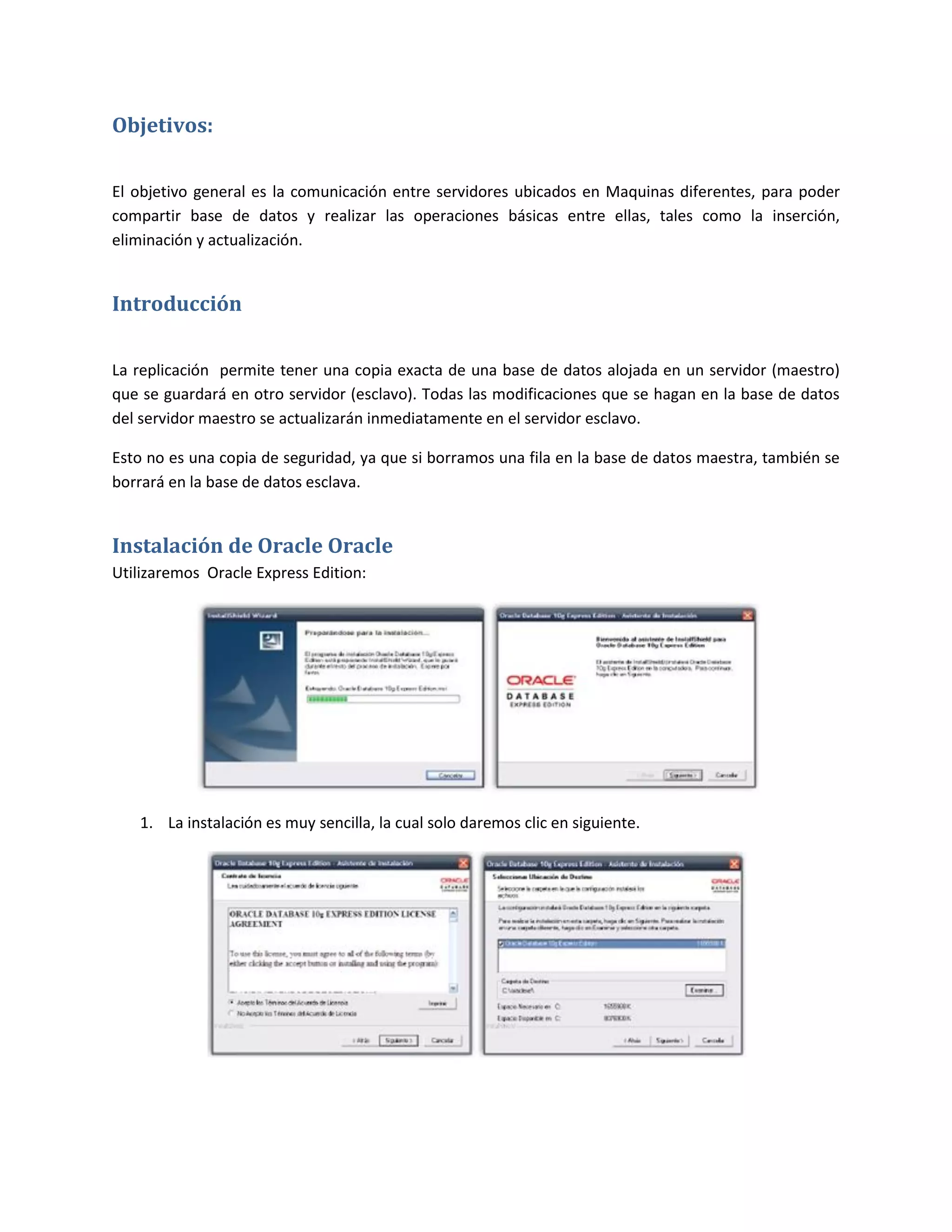 El documento describe cómo configurar la replicación de bases de datos entre dos servidores Oracle ubicados en máquinas diferentes. Se instala Oracle Express Edition en ambos servidores, se configuran las IPs, se crea un usuario con privilegios en ambas bases de datos, y un enlace de base de datos entre ellas. Luego, se crea una tabla en el servidor maestro, y un trigger que replica automáticamente cualquier cambio en la tabla maestra a la tabla esclava. Esto permite compartir y sincronizar datos entre los servidores de forma automática.