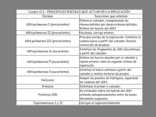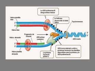 La replicación del ADN es el proceso semiconservativo y bidireccional por el cual una molécula de ADN se duplica para producir dos moléculas idénticas. La replicación ocurre gracias a una maquinaria enzimática que incluye helicasa, ADN polimerasa y otros enzimas. Estos enzimas separan las cadenas de ADN y sintetizan cadenas complementarias nuevas en dirección 5' a 3'.