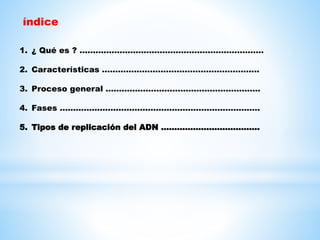 Este documento describe la replicación del ADN. Explica que la replicación del ADN permite duplicar el ADN de una célula para producir dos moléculas idénticas durante la división celular. Se divide el proceso en tres fases: iniciación, elongación y terminación. También discute los tres modelos teóricos de replicación: conservadora, dispersora y semiconservadora, siendo esta última la correcta.