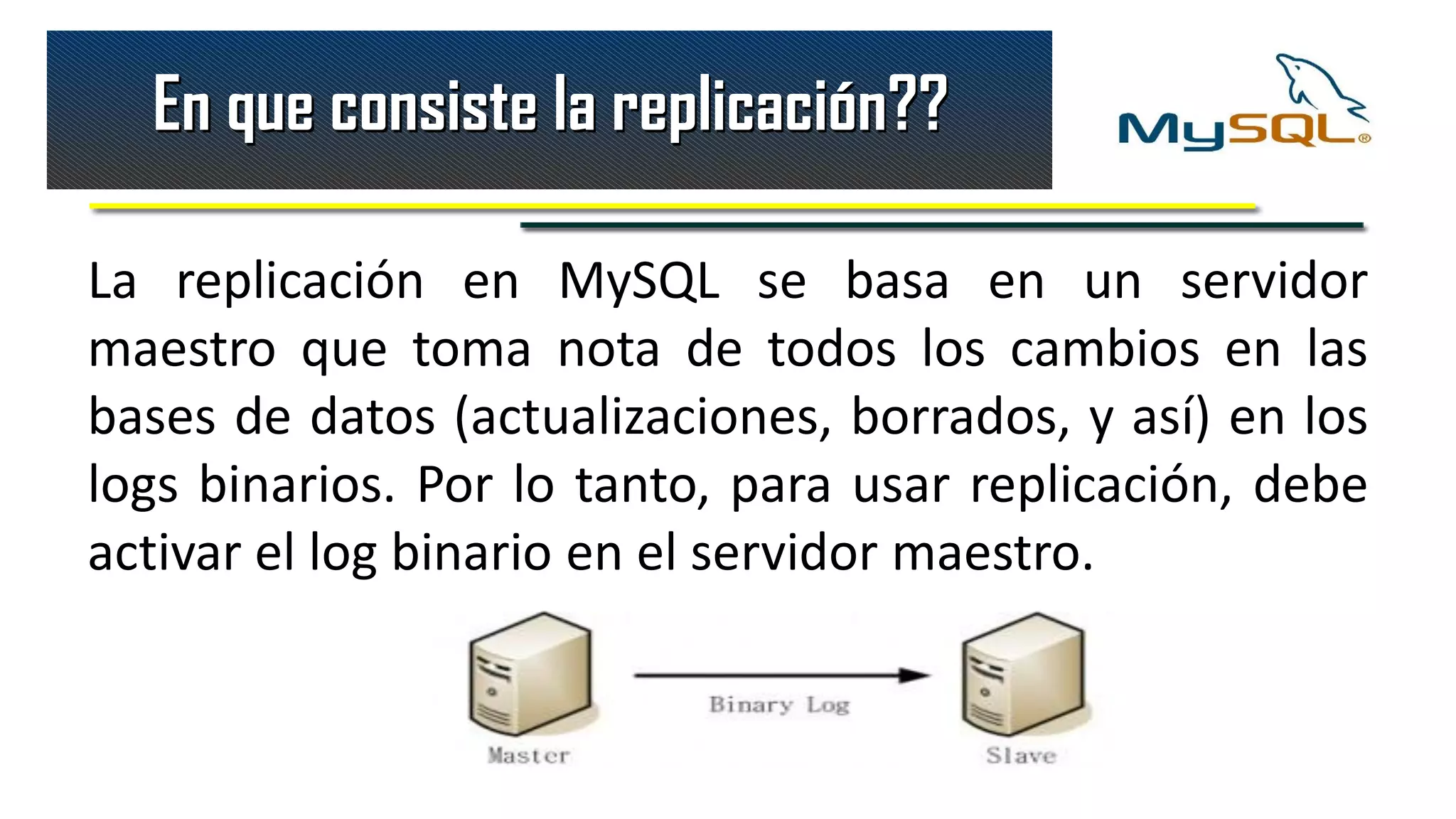 Este documento describe los tipos y configuración de la replicación en MySQL, incluyendo maestro-esclavo y maestro-maestro. Explica cómo configurar la replicación activando el log binario en el maestro, creando usuarios de replicación, y configurando los esclavos para que obtengan actualizaciones del maestro.