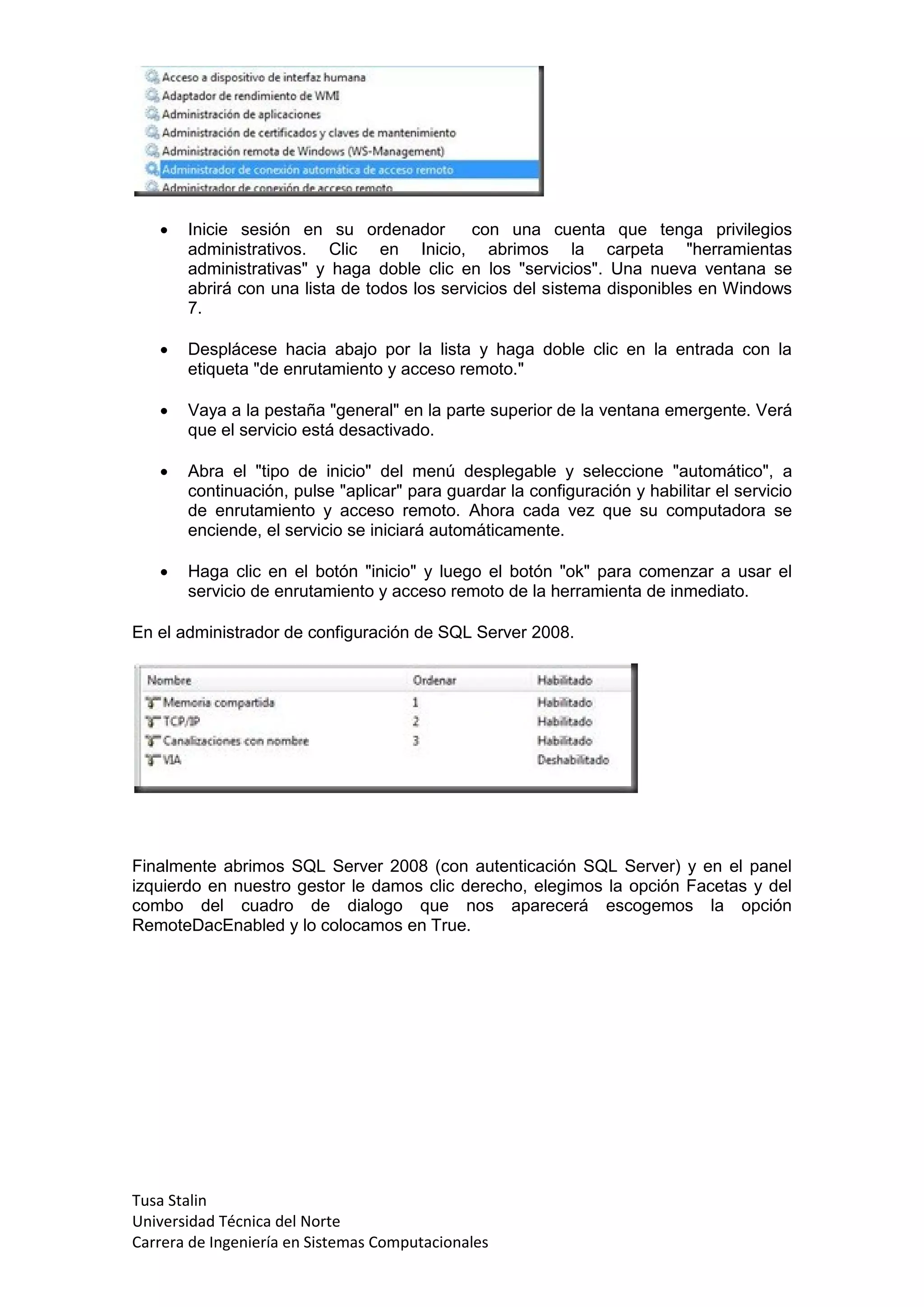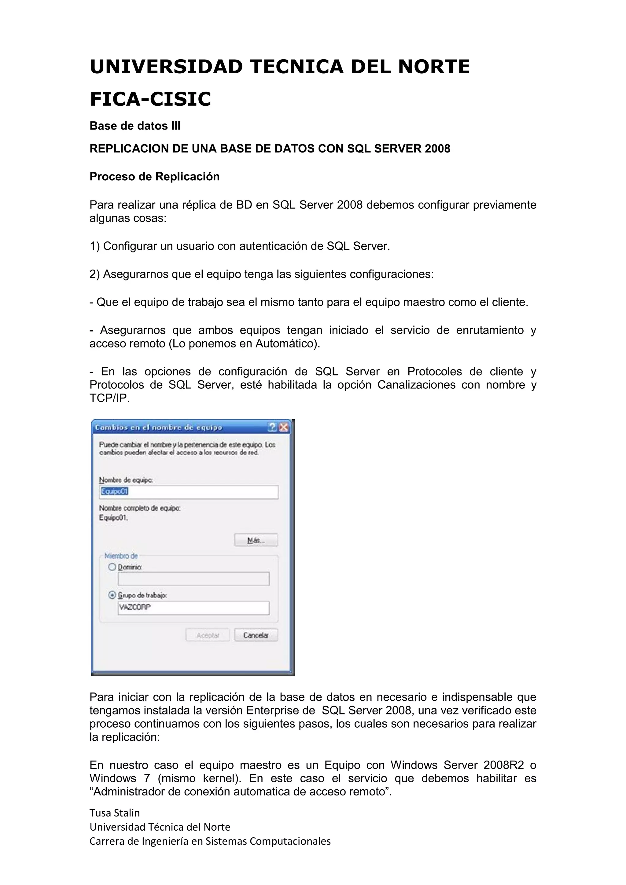El documento describe los pasos para replicar una base de datos en SQL Server 2008, incluyendo configurar usuarios y servicios en los equipos maestro y cliente, publicar la base de datos en el maestro, y crear una suscripción en el cliente para replicar la base de datos en este equipo.