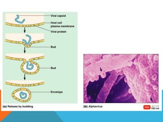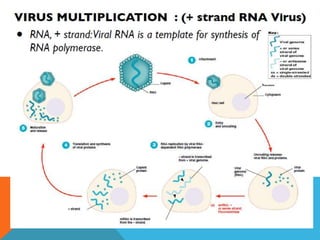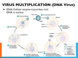 Los virus se multiplican únicamente en células vivas, utilizando su maquinaria para la síntesis según el tipo de ácido nucleico. La replicación viral consta de siete pasos: adsorción, penetración, desnudamiento, replicación, ensamblaje, maduración y liberación, donde los virus envueltos adquieren su envoltura durante la gemación. El documento detalla el proceso de infección y replicación de virus ADN y ARN en células huésped.