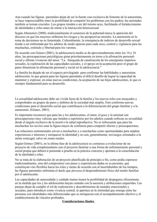Este documento trata sobre la adolescencia y el género. Se divide en dos capítulos. El primer capítulo define la adolescencia como un período crucial de desarrollo que incluye cambios físicos, emocionales e intelectuales. Describe tres fases de la adolescencia - puberal, media y tardía - caracterizadas por preocupaciones como la imagen corporal, afirmación personal y búsqueda de identidad. El segundo capítulo explica que el género se refiere a roles aprendidos culturalmente como femenino y masculino, más que características