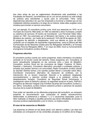El Consultorio Jurídico Guillermo Peña Alzate de la Universidad de Antioquia ofrece asesoría jurídica gratuita a personas de bajos recursos en Medellín y regiones vecinas. El consultorio, fundado en 1968, busca contrarrestar los prejuicios sobre los abogados y promover el acceso a la justicia. Los estudiantes de derecho brindan asesoría bajo supervisión para adquirir experiencia práctica y cumplir con su función social. A pesar de limitaciones espaciales, el consultorio