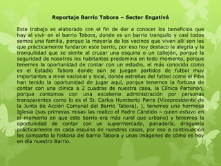 Este documento presenta una descripción del barrio Tabora ubicado en la localidad de Engativá en Bogotá. Explica que Tabora es un barrio tranquilo donde sus habitantes se sienten seguros y cuentan con servicios como un estadio, una clínica, una iglesia y comercios. También brinda detalles sobre la ubicación, infraestructura e historia de Engativá.