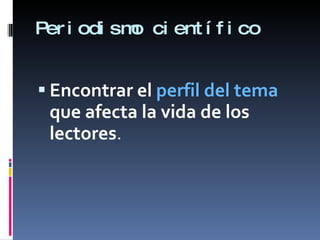 Este documento ofrece consejos para escribir periodismo científico de manera que sea accesible y relevante para lectores no expertos. Recomienda encontrar historias que muestren cómo los descubrimientos científicos afectan la vida cotidiana, traduciendo conceptos complicados de manera sencilla. También sugiere seguir "personajes" no humanos como plantas o sistemas, y narrar las historias desde la perspectiva de un aprendiz en lugar de un experto.