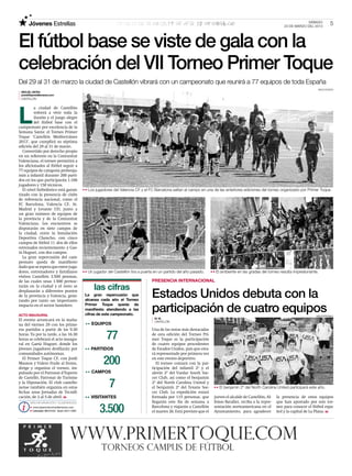 El torneo Primer Toque 'Castellón Mediterráneo 2013' se celebrará del 29 al 31 de marzo en Castellón, reuniendo a 77 equipos de España en un evento que contará con la participación de 1.100 jugadores. La edición de este año destaca por la inclusión de cuatro equipos de Estados Unidos, marcando su debut internacional. Se esperan alrededor de 3,500 visitantes, lo que generará un impacto significativo en el sector hostelero de la región.