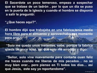Un sacerdote observa a un hombre pobre que viene a la iglesia todos los días al mediodía solo para arrodillarse brevemente y orar. El sacerdote descubre que el hombre trabaja en una fábrica lejos y usa su tiempo de almuerzo para orar. Más tarde, cuando el hombre enferma gravemente, el sacerdote lo visita en el hospital y descubre que el hombre está feliz a pesar de no tener visitas, porque cree que Jesús viene a verlo todos los días.