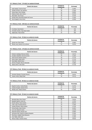 Este documento resume la asistencia de alumnos de una institución educativa entre marzo y diciembre de 2013. Reporta que 73 alumnos se encuentran en riesgo de reprobar debido a que su asistencia está por debajo del 80%, límite establecido por la institución. Proporciona detalles como el número de días hábiles en el período y la asistencia de cada alumno en riesgo organizada por curso y turno.