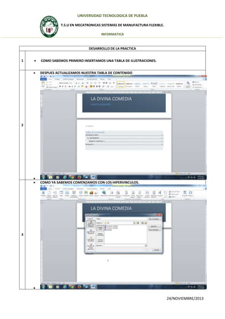 Este documento presenta los objetivos y desarrollo de la Práctica 6 de un estudiante de Ingeniería Mecatrónica. El objetivo era complementar un ensayo previamente creado en Word insertando imágenes a través de hipervínculos. El estudiante insertó una tabla de ilustraciones, actualizó la tabla de contenido e incluyó hipervínculos a 5 imágenes relacionadas con el ensayo.