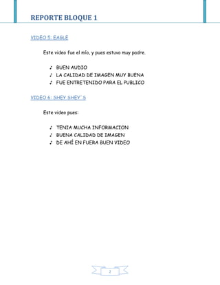 El reporte evalúa 6 videos. Dos videos tuvieron problemas de audio y calidad de imagen. Un video no tuvo errores y fue entretenido. El video del reportero sobre águilas tuvo buen audio, imagen y fue entretenido. Otro video tuvo buena información, imagen y calidad general.