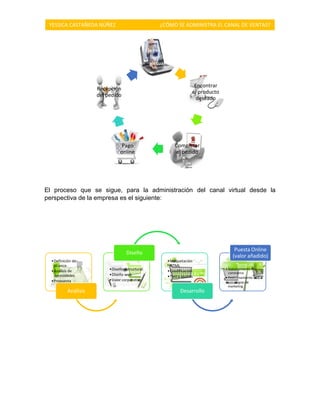 El documento describe los diferentes canales de ventas que pueden administrarse, incluyendo ventas en vivo, ventas por teléfono, correo directo, ventas por internet y exposiciones. Explica que la administración del canal de ventas electrónico involucra atraer clientes, encontrar productos, completar pedidos, pagos en línea y recibir pedidos, tanto desde la perspectiva del cliente como de la empresa. También cubre los modelos por los cuales se puede administrar una plataforma de ventas en línea.