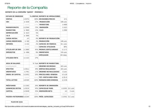El reporte muestra los resultados financieros de la compañía "Queen" para el período 4. Ventas fueron de $30,753 con una utilidad neta de $11,323 (37% de las ventas). La producción fue de 648 unidades con una capacidad de fábrica utilizada del 80%. El informe también incluye detalles sobre decisiones de precios, marketing, producción e inversión.