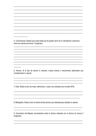Este documento presenta un formato para la elaboración de informes de lectura según el estilo APA. Explica las secciones principales que debe contener un informe, incluyendo la portada, resumen, cuerpo principal y referencias. También describe los lineamientos generales de formato y estilo, como el uso de doble espacio, margenes de 2.54 cm, tipo de letra Times New Roman tamaño 12, y encabezados en cada página. El resumen debe tener entre 150-250 palabras y resumir el tema, preguntas, métodos, resultados y conclusion