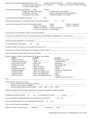 Este documento es un reporte de accidente automovilístico que recopila información sobre las circunstancias del accidente, incluyendo la fecha, hora, ubicación, velocidad, visibilidad, estado de la carretera, detalles sobre los vehículos involucrados, y síntomas físicos experimentados por la persona luego del accidente.