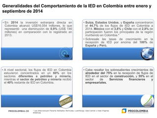 En 2014, la inversión extranjera directa en Colombia alcanzó los US$16.054 millones, disminuyendo un 0,9% con respecto a 2013. Aunque algunos sectores como petróleo y minería registraron caídas, otros como construcción y servicios financieros mostraron aumentos de hasta el 75%. Estados Unidos, Suiza y España concentraron el 44,7% de la inversión extranjera directa en Colombia durante 2014.