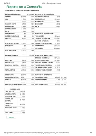El reporte muestra que la compañía JJ-GIM tuvo ventas de $10,205 pero una utilidad neta de -$1,523, representando una pérdida del 14% de las ventas. La compañía produjo 420 unidades con una capacidad de producción del 80% y gastó $4,000 en marketing. El balance general mostró $9,184 en efectivo, $4,734 en inventario y $21,950 en inversiones de capital.