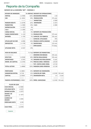 The report summarizes the financial performance of company BFP for the third period. It shows that the company had sales of $27,000 with a gross margin of 62% and net income of $5,247. The balance sheet indicates the company has $23,448 in cash, $3,970 in inventory, and $21,450 invested in capital assets. The cash flow statement shows an ending cash balance of $23,448 after accounting for net income, depreciation, changes in inventory, capital investments, and new loans.