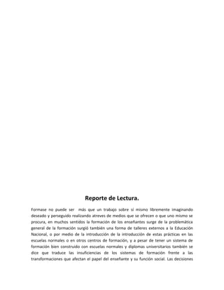 Este documento discute la formación de los profesores. Señala que la formación de profesores surge de problemas generales de formación y que a pesar de tener un sistema de formación bien construido con escuelas normales y diplomas universitarios, también tiene insuficiencias frente a los cambios en el papel del profesor. La formación de profesores incluye etapas escolares, es una formación doble que incluye lo académico y lo profesional, y es una formación de formadores.