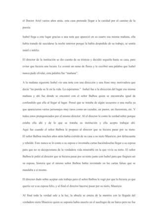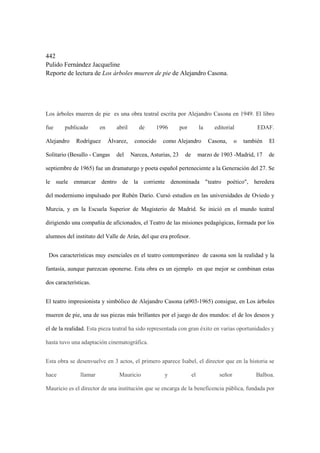 La obra teatral "Los árboles mueren de pie" de Alejandro Casona cuenta la historia de Isabel, quien llega a una institución de beneficencia dirigida por Mauricio luego de tratar de suicidarse. El señor Balboa le pide a Mauricio que se haga pasar por su nieto para engañar a su esposa. Cuando regresa el verdadero nieto, se revela la verdad. Aun así, la abuela decide continuar la ficción para mantener su ilusión, al igual que los árboles que mueren en pie