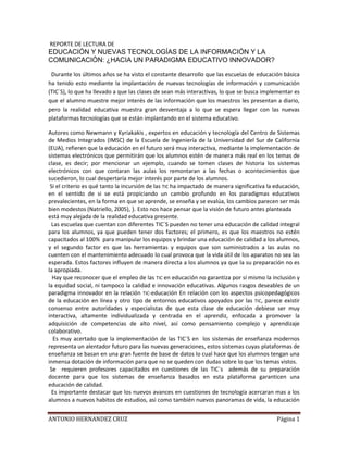 El documento discute el impacto de las nuevas tecnologías de la información y la comunicación (TIC) en la educación. Aunque las TIC prometen hacer la enseñanza más interactiva, la realidad es que los cambios han sido modestos y la visión del futuro está alejada de la realidad actual. Los desafíos incluyen capacitar a los maestros y mantener los equipos, para garantizar una educación de calidad e innovadora. Las TIC no garantizan por sí solas la inclusión o equidad, se necesita un enfoque centrado en