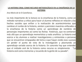 1) El primer documento discute el uso de la historia oral como un método narrativo y crítico para hacer que los estudiantes reflexionen sobre los eventos históricos y cómo afectaron el curso de la historia.