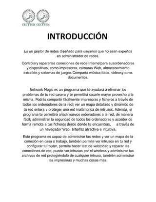 Este documento describe las funciones del programa Network Magic, el cual permite administrar redes de manera sencilla sin necesidad de ser un experto. Network Magic permite verificar y reparar conexiones de red, medir la velocidad de Internet, conectarse a redes inalámbricas, cambiar la configuración de seguridad inalámbrica, compartir carpetas e impresoras, solucionar problemas de uso compartido, controlar el acceso a Internet, realizar capturas de pantalla del escritorio, ver informes de equipos, ver un mapa de la red que
