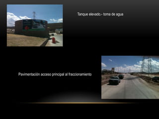 El reporte de obra del fraccionamiento Monterra incluye la instalación de un tanque elevado para el suministro de agua, la pavimentación del acceso principal al fraccionamiento y de una calle, así como la compra de materiales para instalaciones sanitarias.