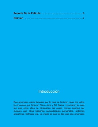 El documento describe la evolución de Apple y Microsoft, fundadas por Steve Jobs y Bill Gates respectivamente. Ambos querían que sus empresas fueran líderes en el mercado de computadoras personales y sistemas operativos. Aunque inicialmente se pirateaban ideas, Apple creció desde un garaje hasta convertirse en corporación mientras que Microsoft aprovechó una oportunidad para adquirir los derechos de un sistema operativo para IBM. La película muestra cómo ambos buscaron oportunidades de negocio a través de la innovación y venta de sus productos.