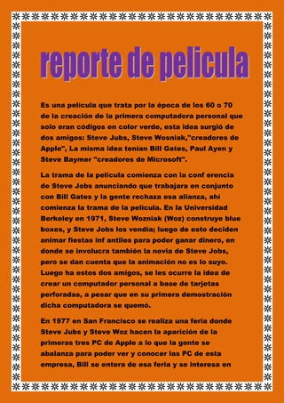 La película trata sobre la creación de la primera computadora personal en los años 1960-1970 por parte de Steve Jobs y Steve Wozniak de Apple y Bill Gates, Paul Allen y Steve Ballmer de Microsoft. Muestra el anuncio de una alianza entre Jobs y Gates que es rechazada, y cómo los fundadores de ambas compañías compitieron para crear las primeras PC, culminando con el éxito inicial de Apple en una feria de 1977 y el despido posterior de Jobs de su propia empresa.