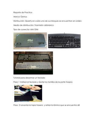 Este documento presenta un reporte de práctica sobre el mantenimiento de equipos de cómputo básicos. Proporciona información sobre un teclado Genius, incluyendo su distribución Qwerty y conector Mini DIM. Además, detalla los 6 pasos para desarmar un teclado y los 6 pasos para volverlo a armar.