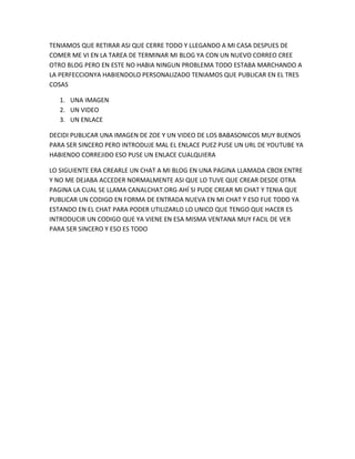 El documento describe los pasos tomados para crear un blog gratuito en internet usando Blogger.com como parte de una tarea escolar. El autor tuvo varios problemas al tratar de iniciar sesión con su correo electrónico, por lo que tuvo que crear una nueva cuenta con un correo en Gmail. Luego de personalizar el blog, este presentó un error y solo mostraba un fondo púrpura, por lo que tuvo que crear otro blog con una cuenta nueva. Finalmente pudo publicar contenido en el blog como una imagen, un video y un enlace. También