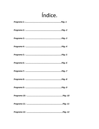 Este documento es el índice de 12 programas de Java desarrollados por el alumno José Manuel Plata Cabello para su clase de Programación impartida por la profesora María de Lourdes Ramírez Villaseñor en el turno matutino del grupo 3 "J". Cada programa resuelve un problema matemático diferente utilizando operaciones básicas y fórmulas.