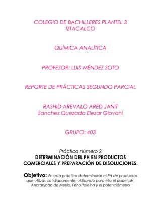 Este documento presenta el reporte de una práctica de laboratorio sobre la determinación del pH en productos comerciales y la preparación de disoluciones de ácido clorhídrico y hidróxido de sodio. Se midió el pH de varios productos usando papel pH, indicadores y un potenciómetro. Los resultados mostraron que cada producto tiene un pH característico. Adicionalmente, se describen conceptos clave como el equilibrio químico y teorías ácido-base necesarias para entender las reacciones que ocurren.